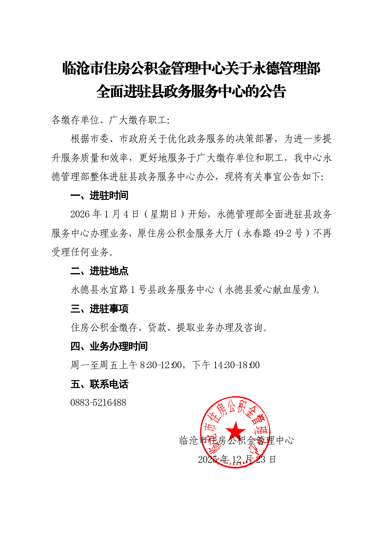 临沧市住房公积金管理中心关于永德管理部全面进驻县政务中心的公告